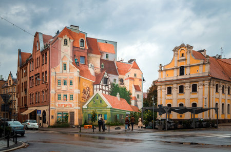 Facade of an old residential building on the street of the city, the historical center of Poland