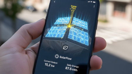 A hand grips a smartphone displaying holographic solar panels, an energy flow diagram, and...