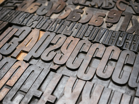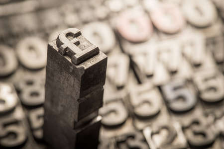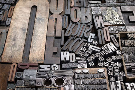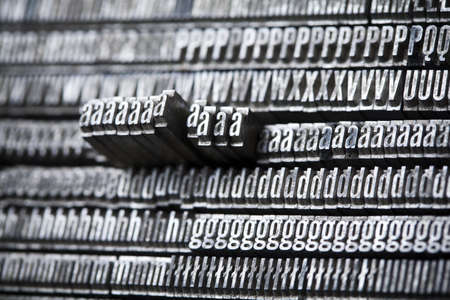 Old lead ink printing type from a book printing company. Historical metal letters from an old printing machine.