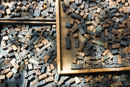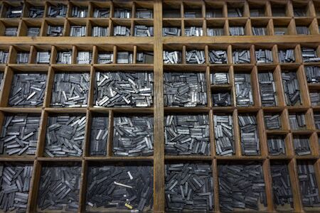 Printing press letter blocks in a wooden shelf Printing industry