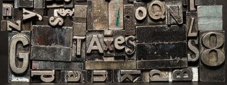 Old printing press typeset spells TAXES