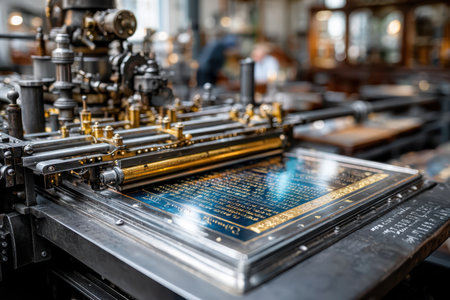 This image captures a vintage printing press in a historical workshop setting, showcasing intricate details of printmaking technology and craftsmanship.
