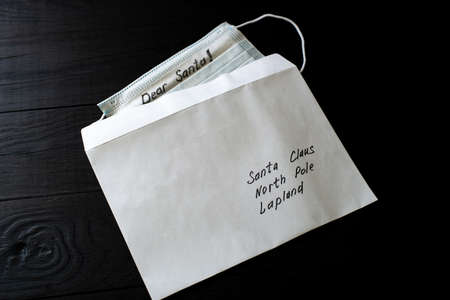 Close-up craft little Christmas gift on white background. Brown craft eco envelope on white background. Christmas holiday concept. Letter to Santa Claus. Rope bow.