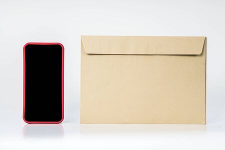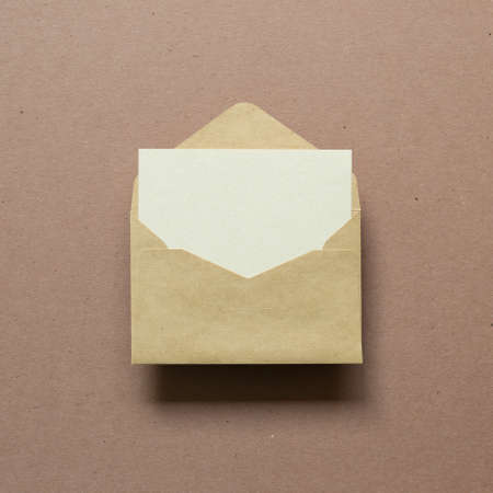 Banner containing craft paper envelope on white background. Copy space. High quality photo