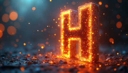 A stunning letter H crafted from glowing particles radiates warmth and energy against a dark, textured background. This captivating image evokes a sense of creativity and innovation, perfect for branding or artistic projects.