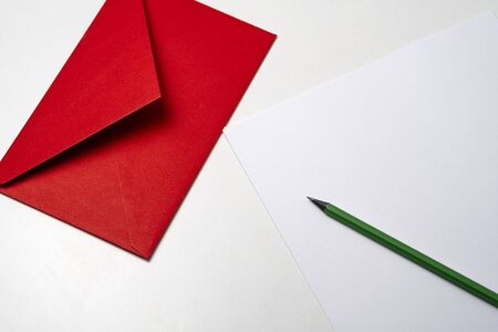 Red envelope, pencil and paper on a white table. Valentines day concept
