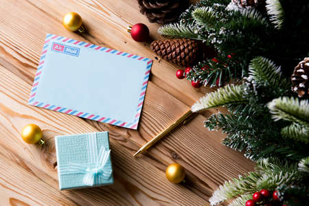 Close up hand man writing by pencil on blank paper letter on wood table with envelope, pinecone, hats and glasses.