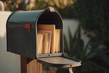 A green mailbox, open with multiple letters emerging from it. The composition features a natural outdoor scene with a blurred green field and sky. The image has a soft focus with warm lighting. It can be utilized for various commercial purposes, including marketing and communication materials.