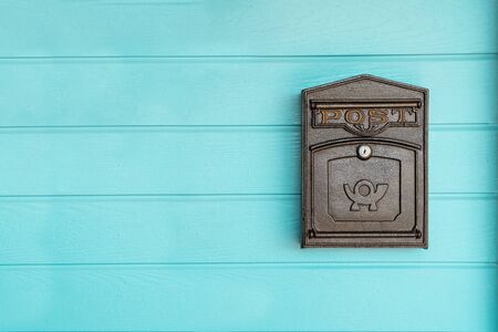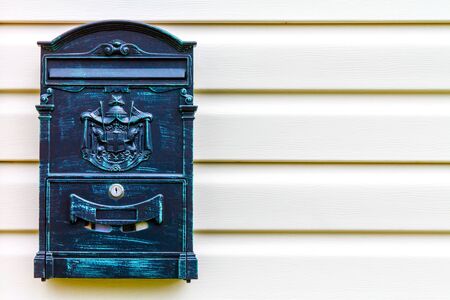 An old blue mailbox hangs on the light wall of an old wooden building. The paint on the surface has aged and swollen. Vintage. Background.