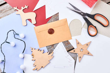 New Year handicraft background, top view. Process of making New Year wooden decorations, flat lay. Happy New Year.