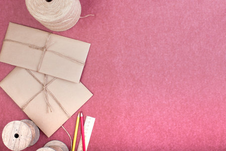 Gift wrapping set on pink. A set of items for gift decoration. Flat lay top view