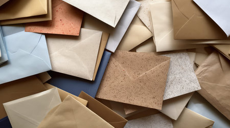 A stack of vibrant envelopes on a desk, ideal for postal services, communication, or stationery brands