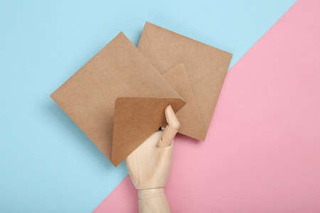 Wooden hand holding craft envelopes on a blue-pink pastel background. top view
