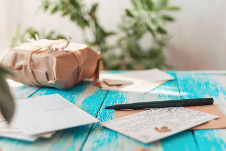 A vintage composition of postcards, a pen with a letter and a parcel. Side view. Blue wooden background. The concept of mail and postcrossing.