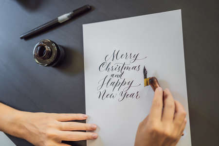 Merry christmas and a happy new year. Calligrapher Young Woman writes phrase on white paper. Inscribing ornamental decorated letters. Calligraphy, graphic design, lettering, handwriting, creation concept