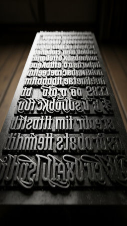 A low angle, vertically composed cinematic photograph of an antique metal printing press block. The