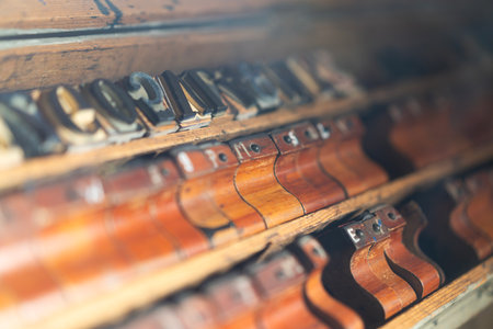 Closeup of vintage metal printing blocks arranged in a wooden drawer used for traditional letterpress printing