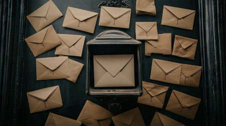Close-up photo of an envelope in a mailbox, with many envelopes scattered on the ground around it, in the style of Unsplash photography. --chaos 30 --ar 16:9 --v 6.1 Job ID: 7e13ca5f-9edd-47db-8e18-4c50a14599bd