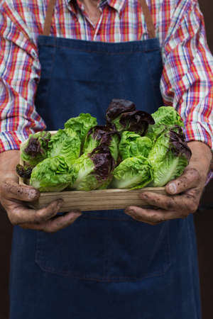 Senior man holding in hands harvest of fresh homegrown lettuce