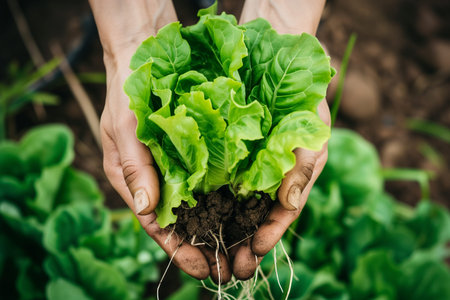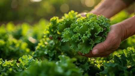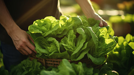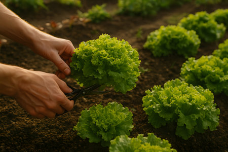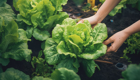 Hands harvesting fresh green lettuce in a garden