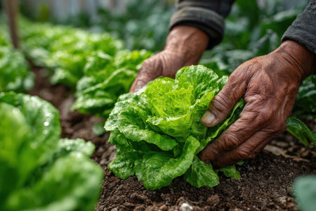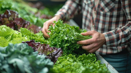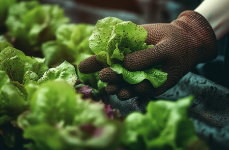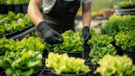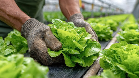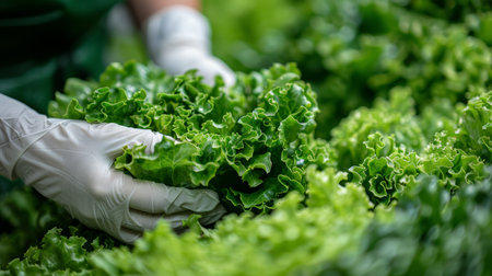 Gloved hands carefully picking a ripe, vibrant green lettuce head in a hydroponic greenhouse, highlighting sustainable agriculture and fresh produce