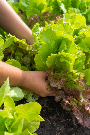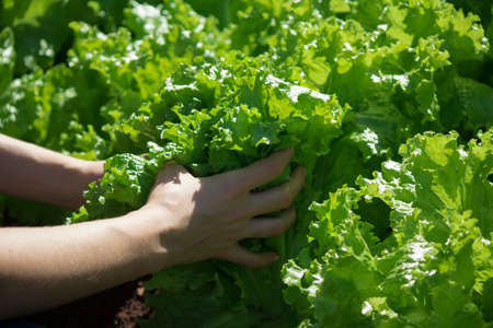 Hand picking lettuce, plant in vegetable garden, close up.