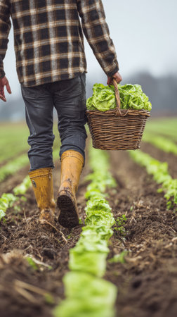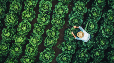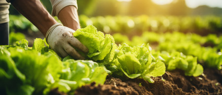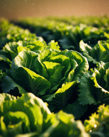 Vibrant lettuce crops in lush, fertile earth bask in warm sunlight, forming orderly lines that extend across a sprawling farmland emphasizing sustainability and nour