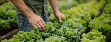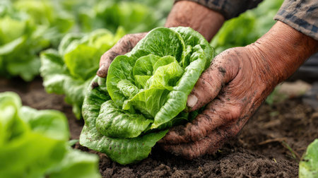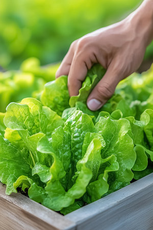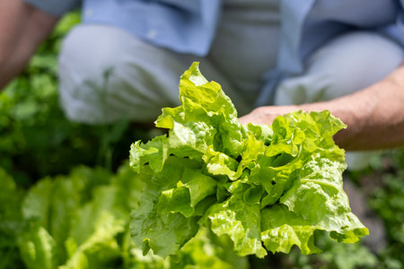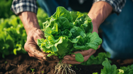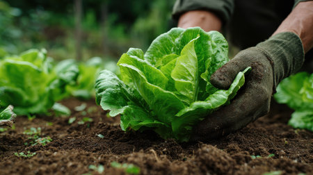Fresh green lettuce salad from the ground. Farmer picking vegetables, organic produce harvested from the garden, organic farming concept.
