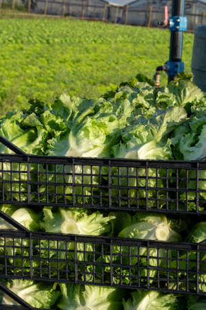 Letuce heads in wooden baskets after manual harvest on organic letuce farm. Agriculture and ecological farming concept.