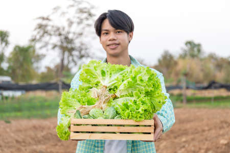 Fresh local organic vegetable in a wooden box holding with cheerful young man, Smart young farmer concept