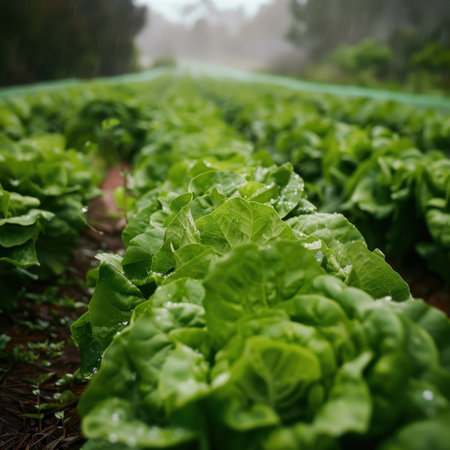 A vibrant field of fresh lettuce glistens under gentle rainfall, showcasing the beauty of nature's bounty and sustainable farming practices in a picturesque setting.