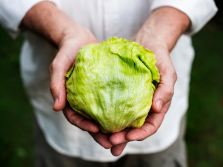 Top view of the hands of a young man holding a fresh green lettuce.