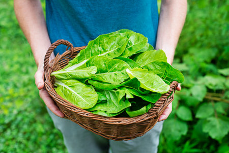 Woman carrying basket with freshly harvested chard leaves in garden. Green swiss chard or silverbeet whole plant the edible leaf lettuce vegetable for healthy food and vegan salad ingredient