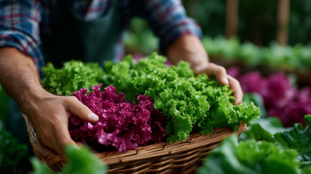 Male farmer carrying full basket of various salad vegetables and working in hydroponics farm.