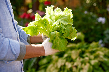 Hands of a senior holds lettuce, dills and green onion, vibrant garden setting. Image suits themes of growth and health, senior life in retirement, life in countryside. High quality photo