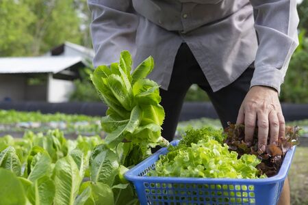 Gradener harvest clean organic salad vegetable in home garden for natural cooking food for health care life style.