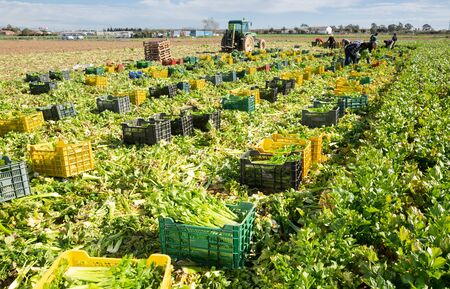 Farm field with freshly harvested green celery in boxes in sunny spring day on background with working people