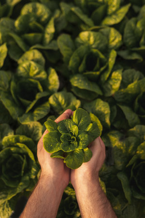 Young farmer holding a bunch of green fresh lettuce in his hands