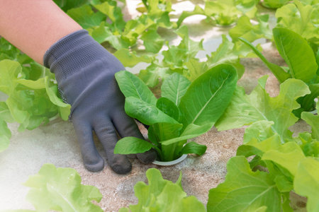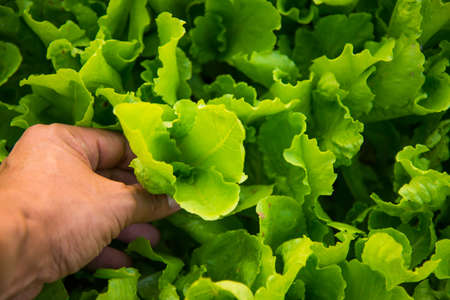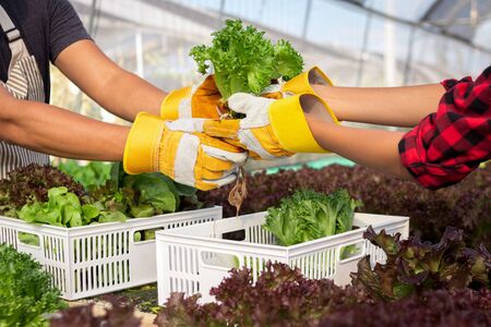 Close up farmers hand is harvesting hydroponic vegetable in greenhouse.