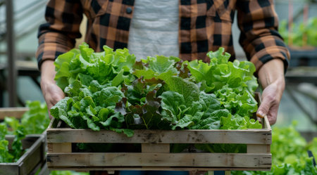 Gardener grower man carrying basket with fresh organic cultivated salad working at vegetable production in greenhouse using hydroponics system during farming season. Concept of agronomy