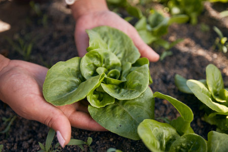 Hands, lettuce and gardening plants for agriculture, sustainable food production and growth in environment. Closeup, farmer and check progress of green leaf vegetables in soil, nature and eco farming