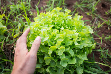 fresh organic green oak lettuce, cos lettuce or Salad vegetable in organic agriculture farm harvest by farmer hand in Thailand, South east Asia. Concept Harvesting Agricultural Farming.