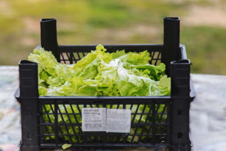 Fresh green lettuce leaves growing in a plant box.