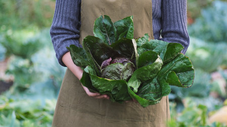 Gardener holding home grown red organic radicchio, open air. Autumn food background. Selective focus.