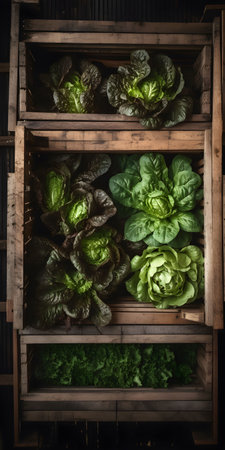 Top view of the bunch of fresh lettuce in a wooden box