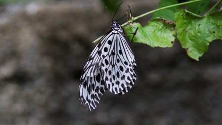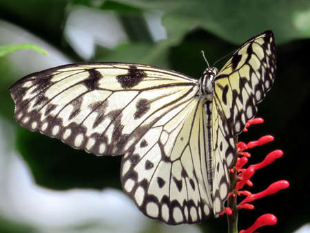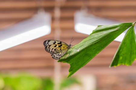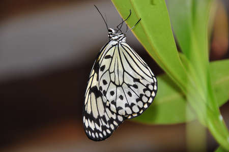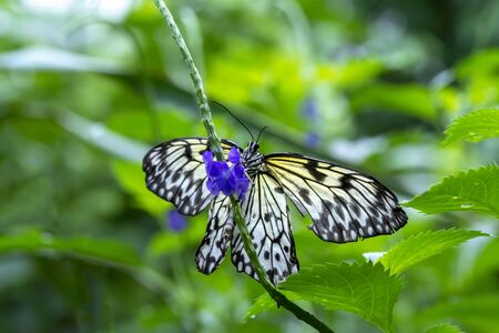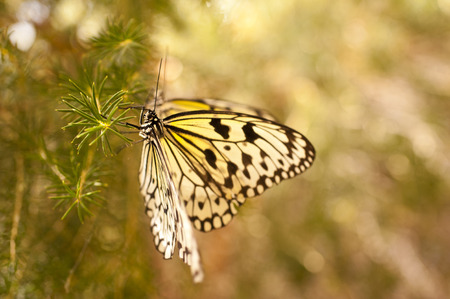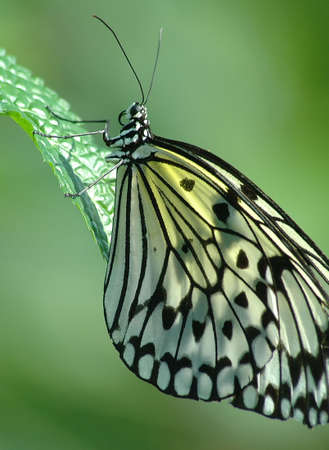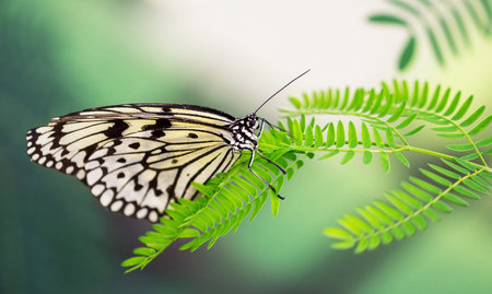 Beautiful The Paper Kite, Rice Paper, or Large Tree Nymph tropical butterfly (Idea Leuconoe) on a leaf. Blurry green background. Presious tropical butterfly with a hint of yellow to the wings.