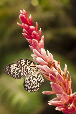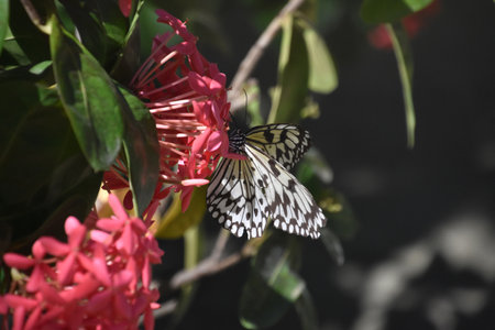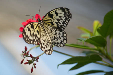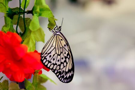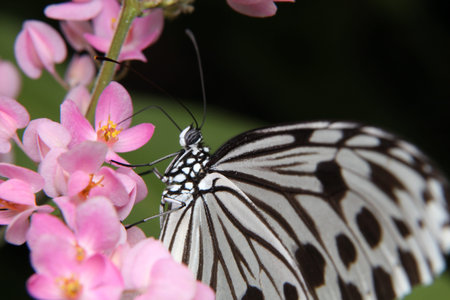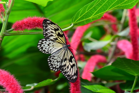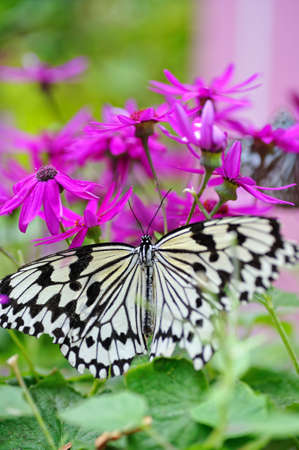 Idea leuconoe, Tree Nymph butterfly, Rice Paper butterfly on pink flower over a blur background. Selective focus