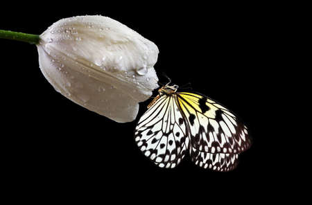 Bright tropical butterfly on white tulip flower in water drops isolated on black. Rice paper butterfly. Large tree nymph. White nymph butterfly.