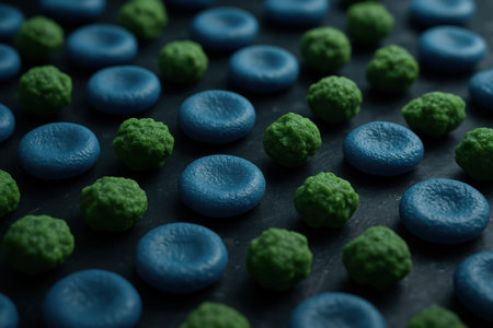 Blue biconcave discs and green irregular cells arranged on a dark surface, simulating a microscopic biological environment for science and medicine.
