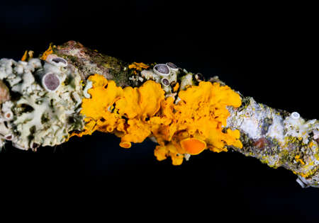 A macro photograph showcases a section of a tree branch covered in a cluster of vibrant orange lichen. The lichen is in full bloom, showcasing its intricate, spherical shape. The branch is covered in moss and other lichen species, creating a diverse and textured background.